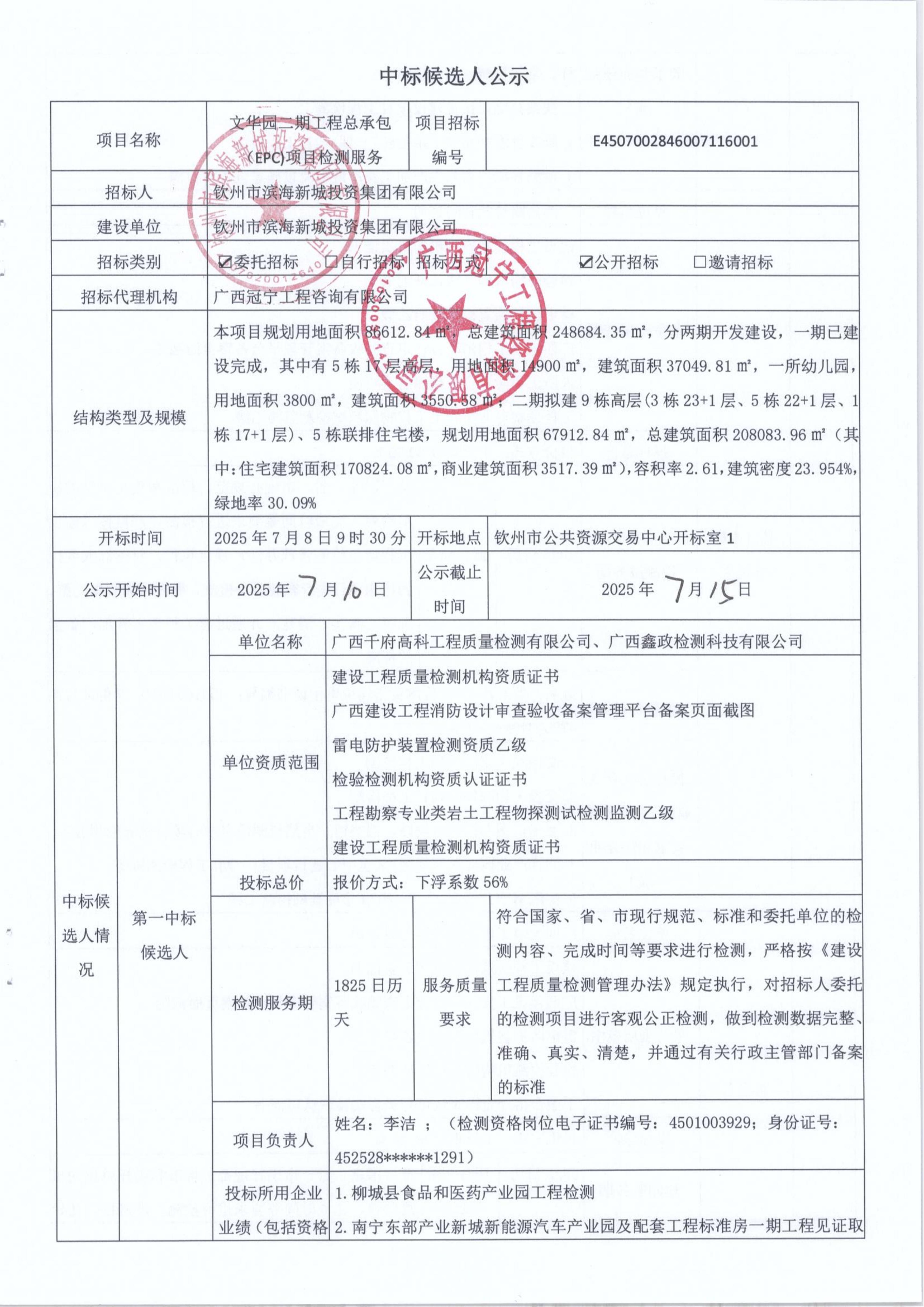 文華園二期工程總承包(EPC)項目檢測服務(wù)工程檢測招標中標候選人公示