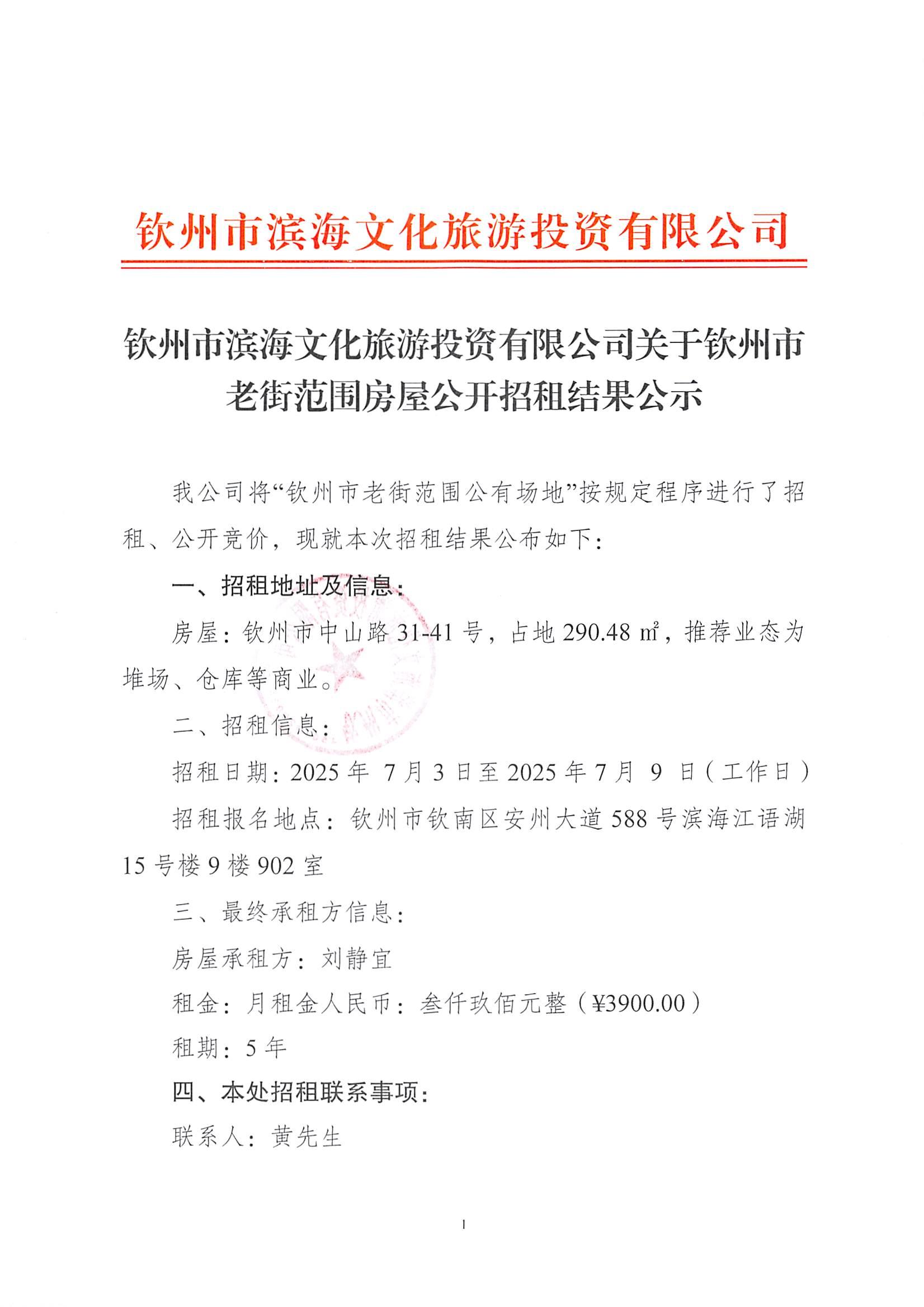 欽州市濱海文化旅游投資有限公司關(guān)于欽州市老街范圍二馬路43號房屋公開招租結(jié)果公示