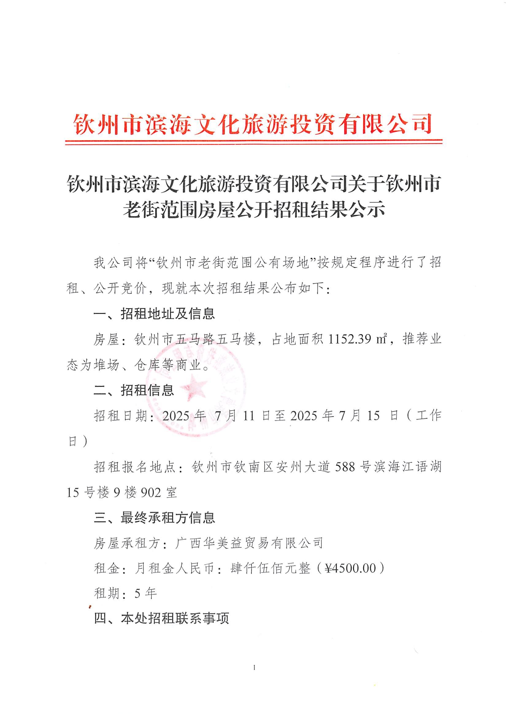 欽州市濱海文化旅游投資有限公司關(guān)于欽州市老街范圍2處房屋公開(kāi)招租結(jié)果公示