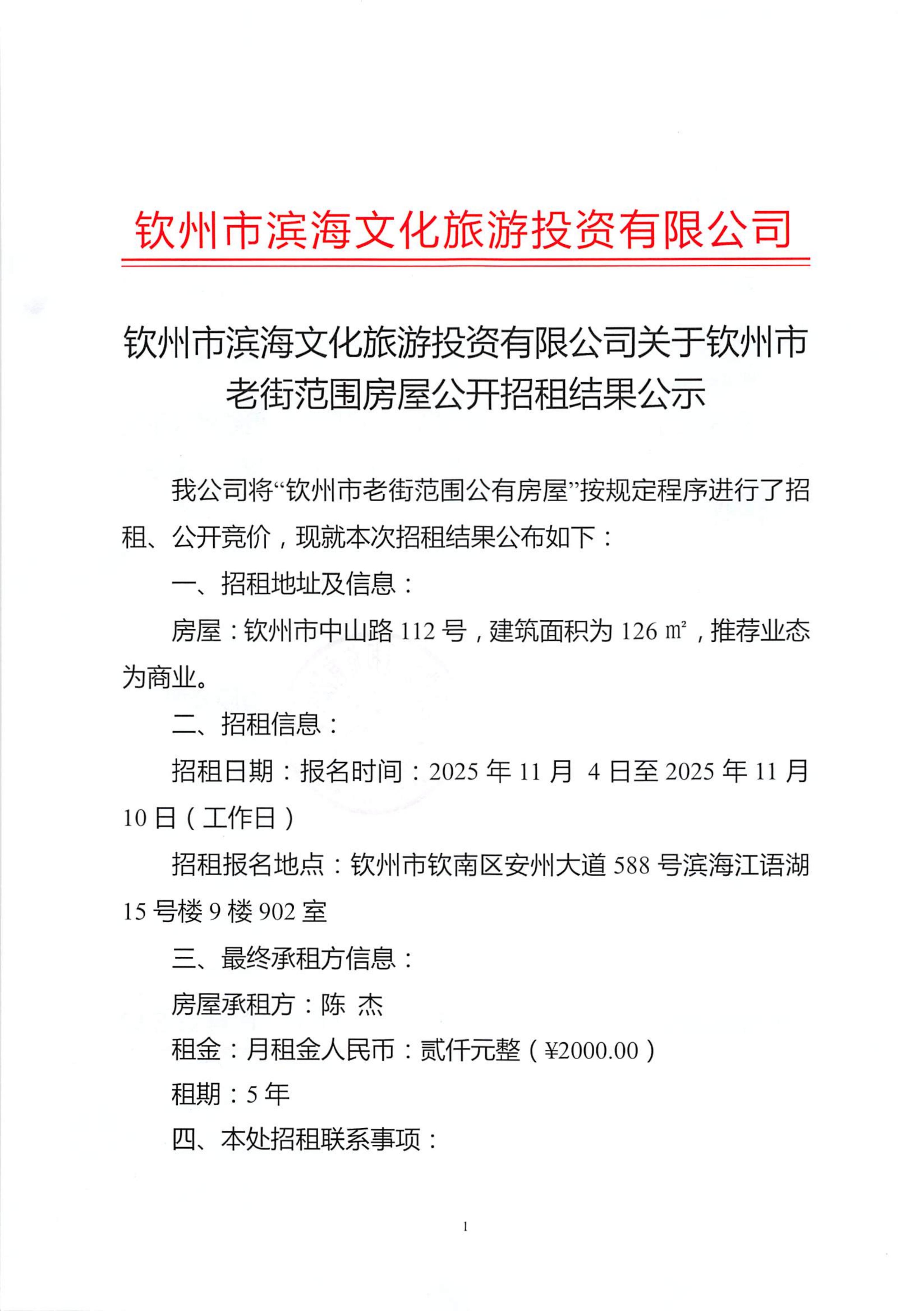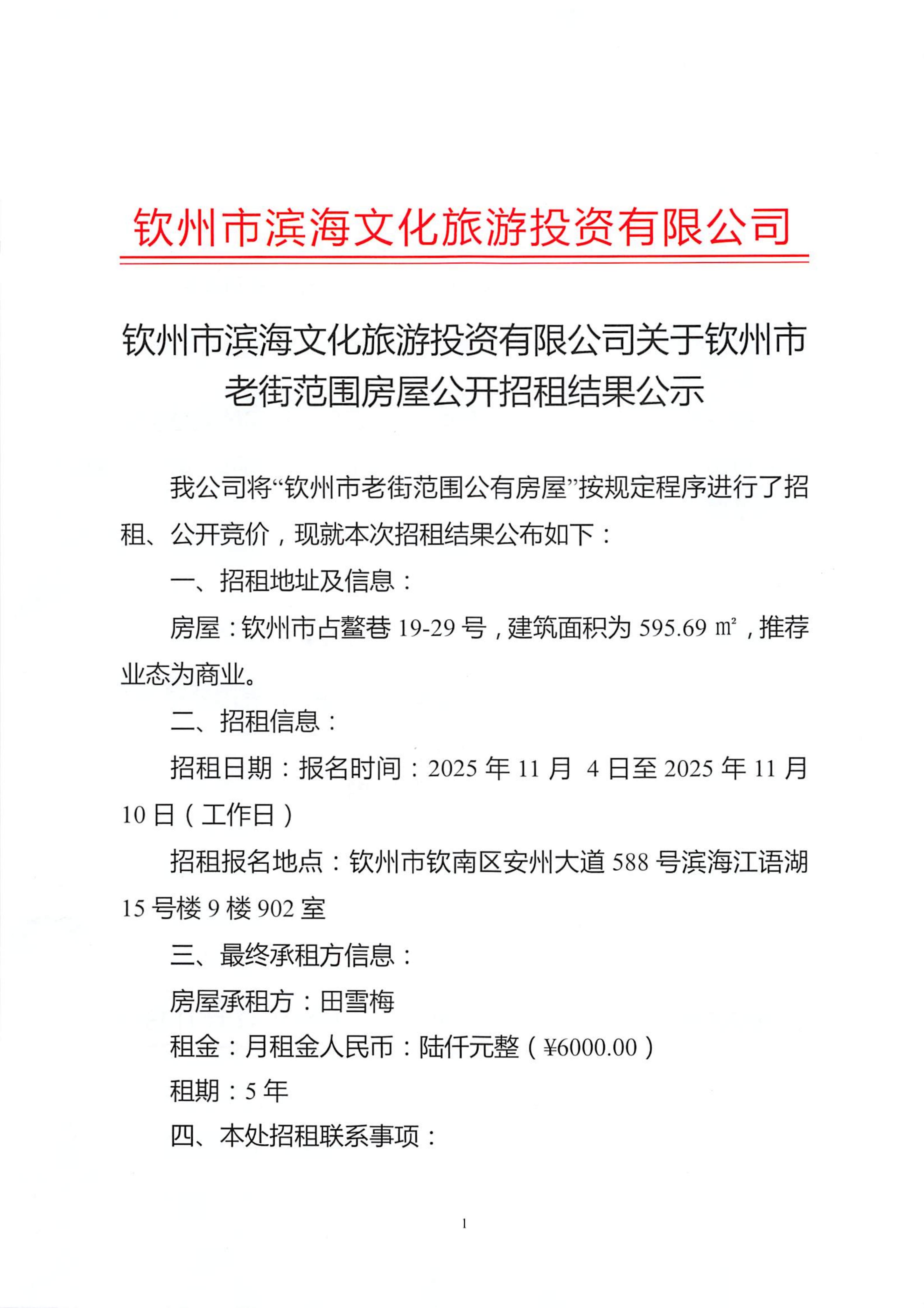 欽州市濱海文化旅游投資有限公司關(guān)于欽州市老街范圍房屋公開招租結(jié)果公示(...