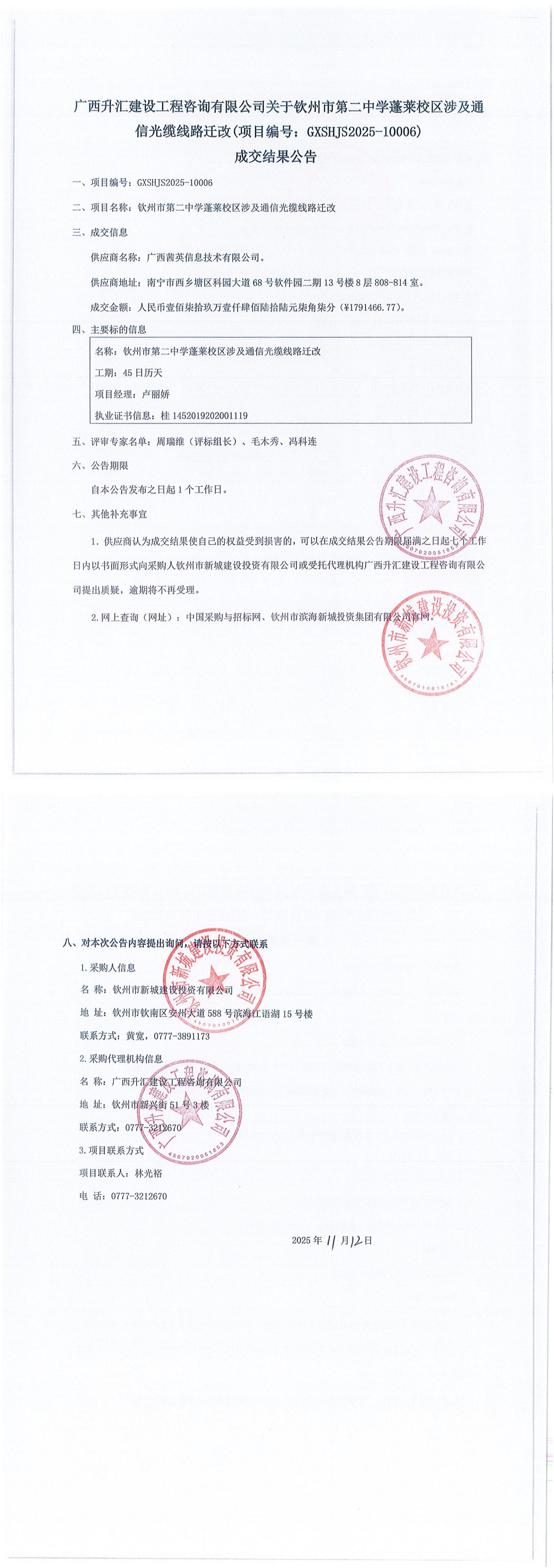 中標(biāo)公告(欽州市第二中學(xué)蓬萊校區(qū)一期項(xiàng)目監(jiān)理)