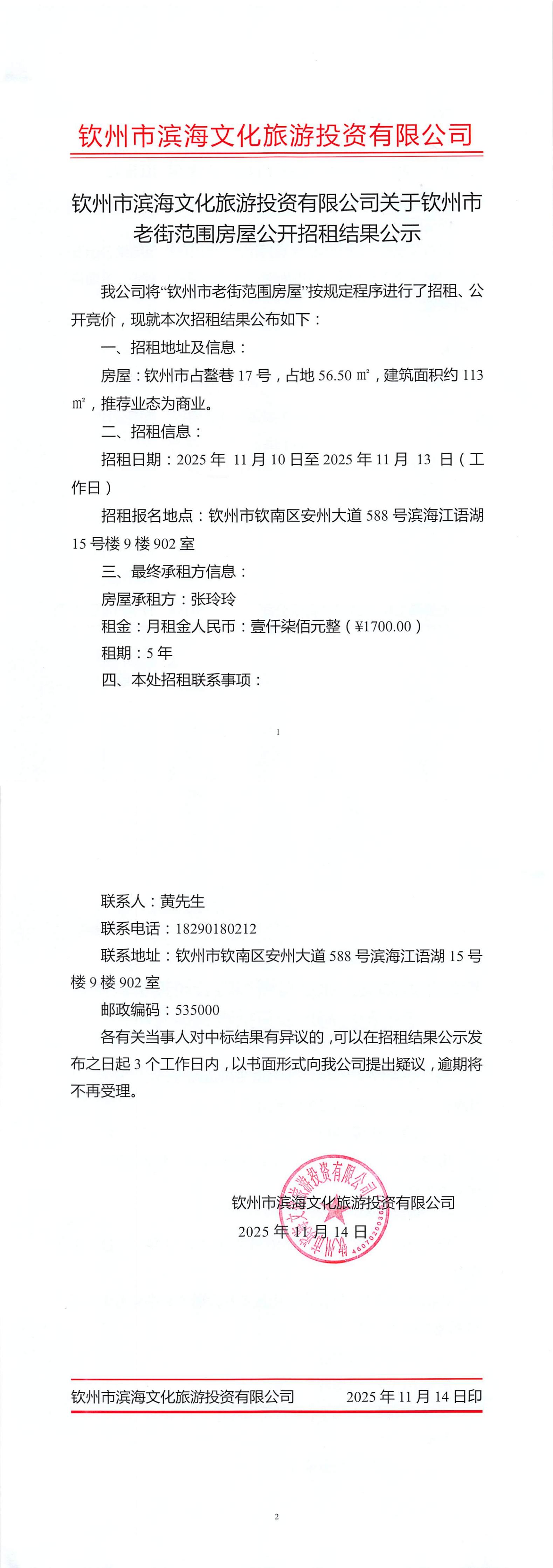 欽州市濱海文化旅游投資有限公司關(guān)于欽州市老街范圍2處房屋公開招租結(jié)果公...