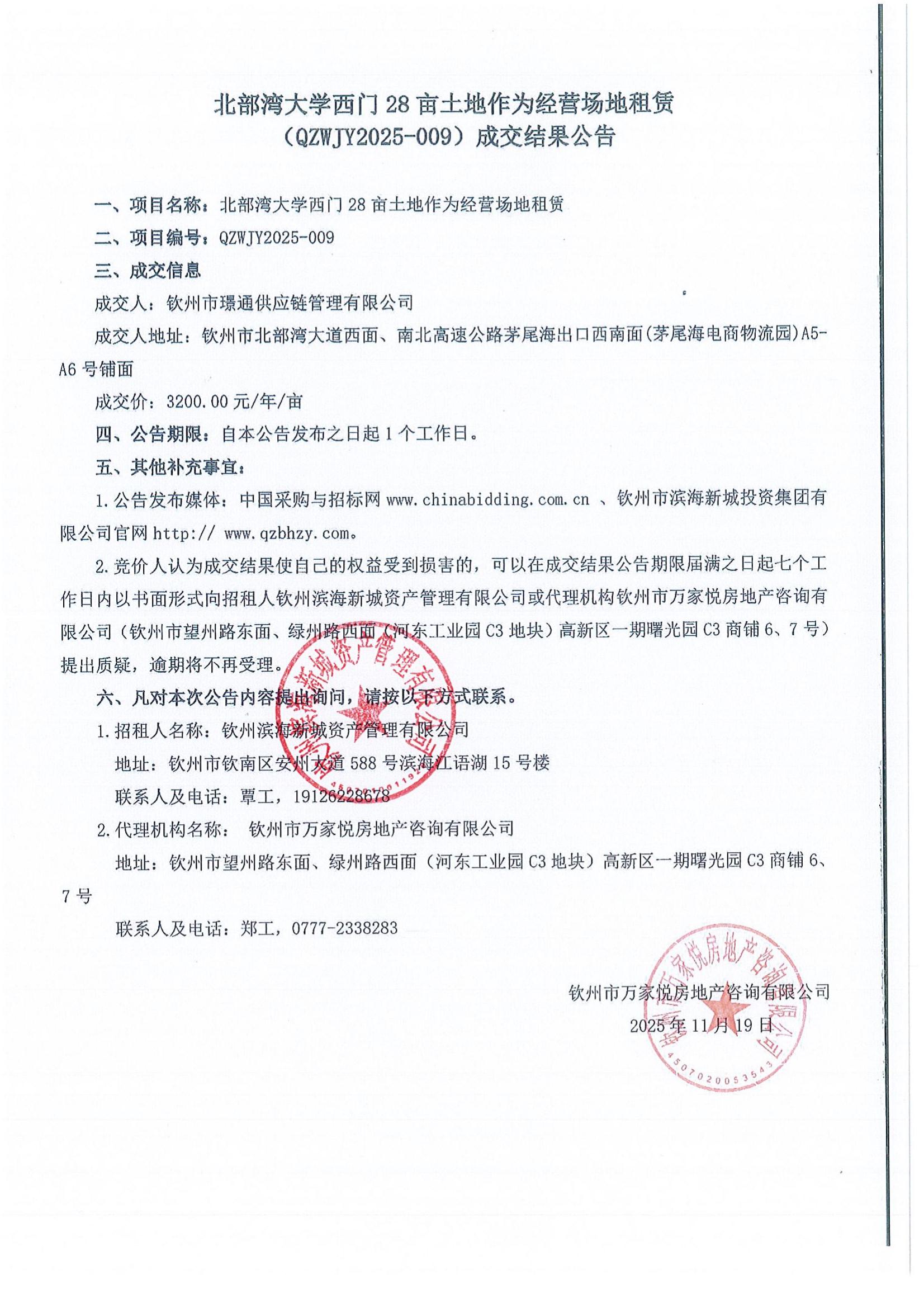大石古村委和凌云街10畝地塊(QZWJY2025-006)成交結(jié)果公告