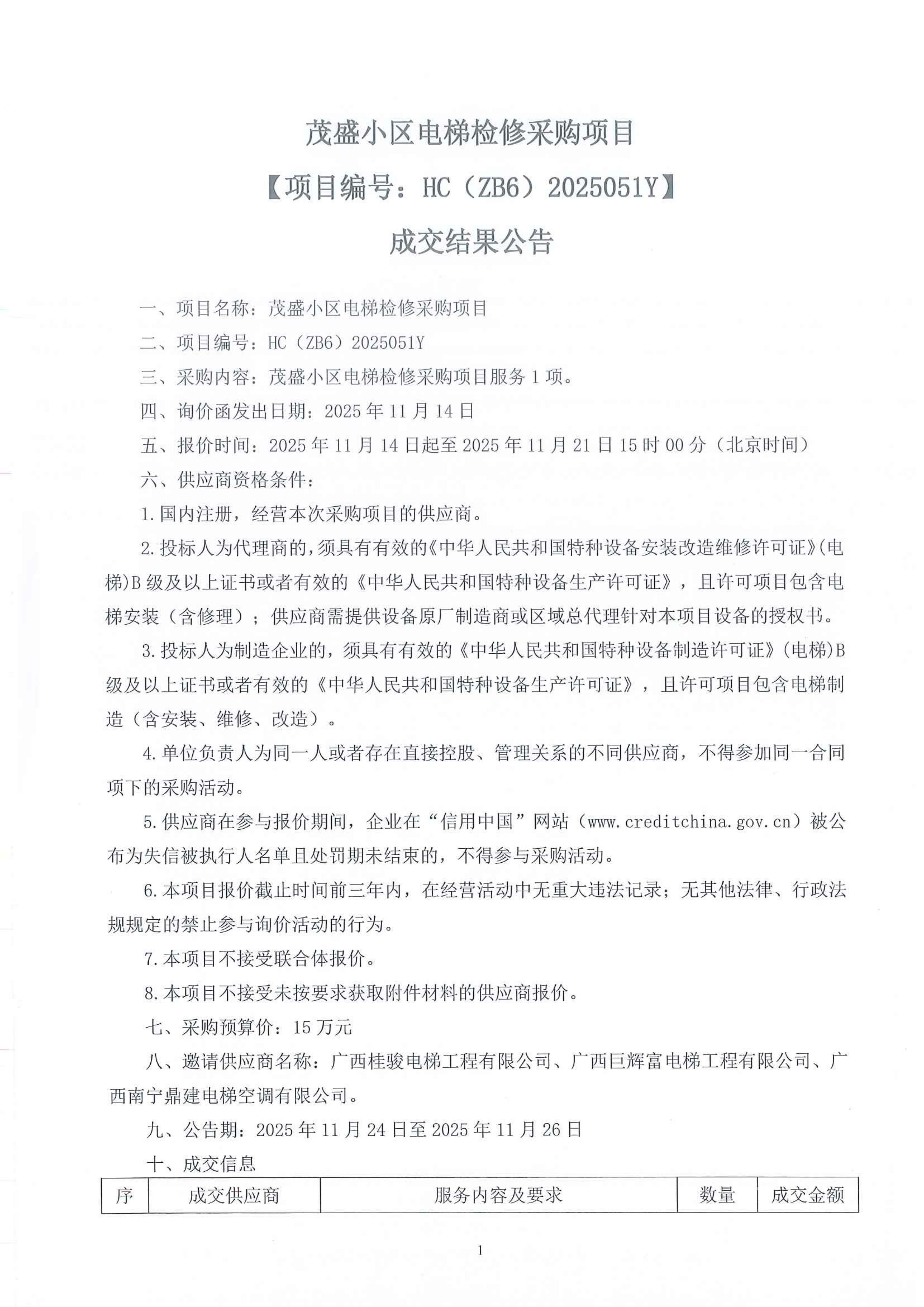 茂盛小區(qū)電梯檢修采購項(xiàng)目【項(xiàng)目編號:HC(ZB6)2025051Y】 ...