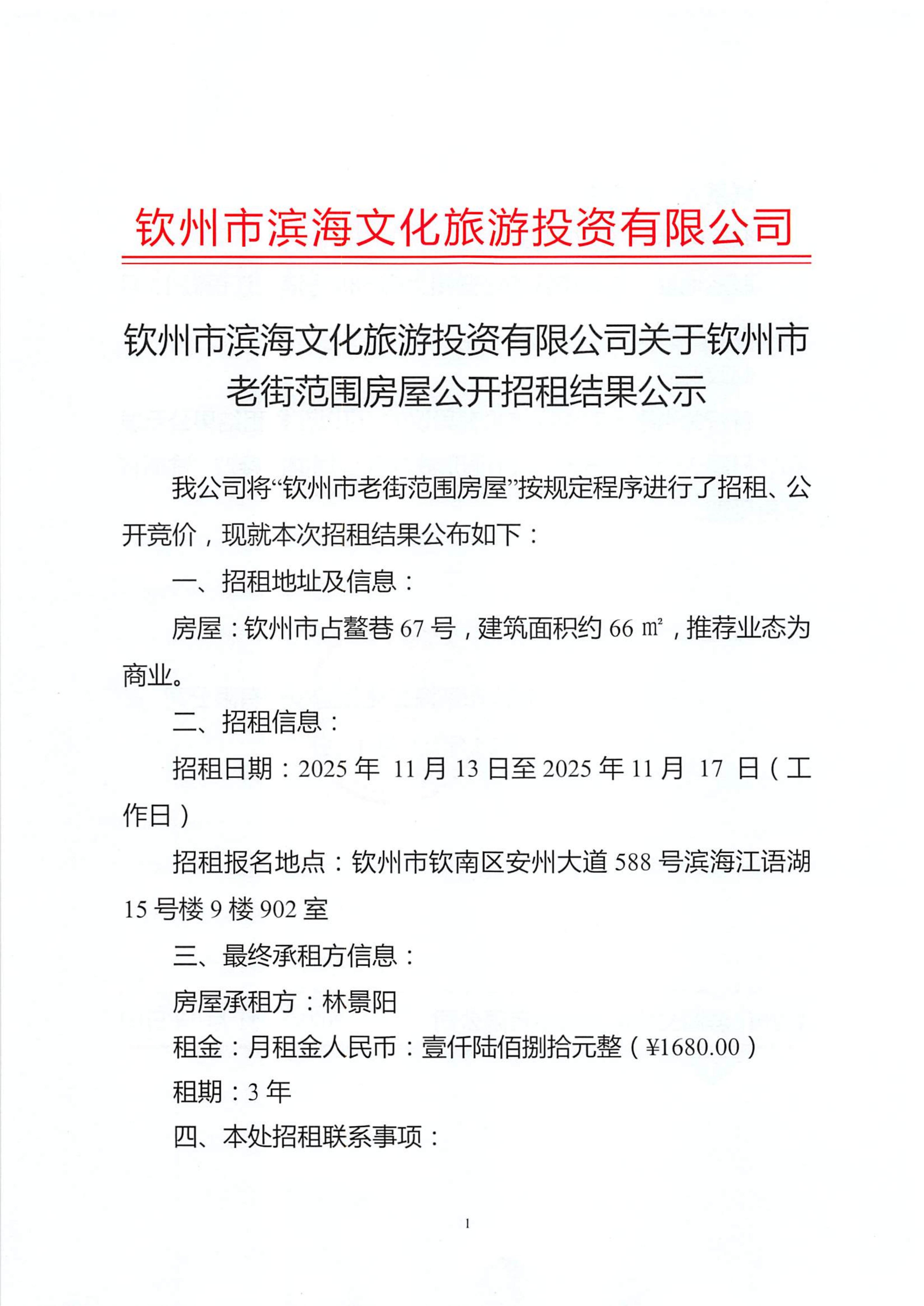 關(guān)于欽州市老街范圍房屋公開招租結(jié)果公示(欽州市占鰲巷67號(hào))