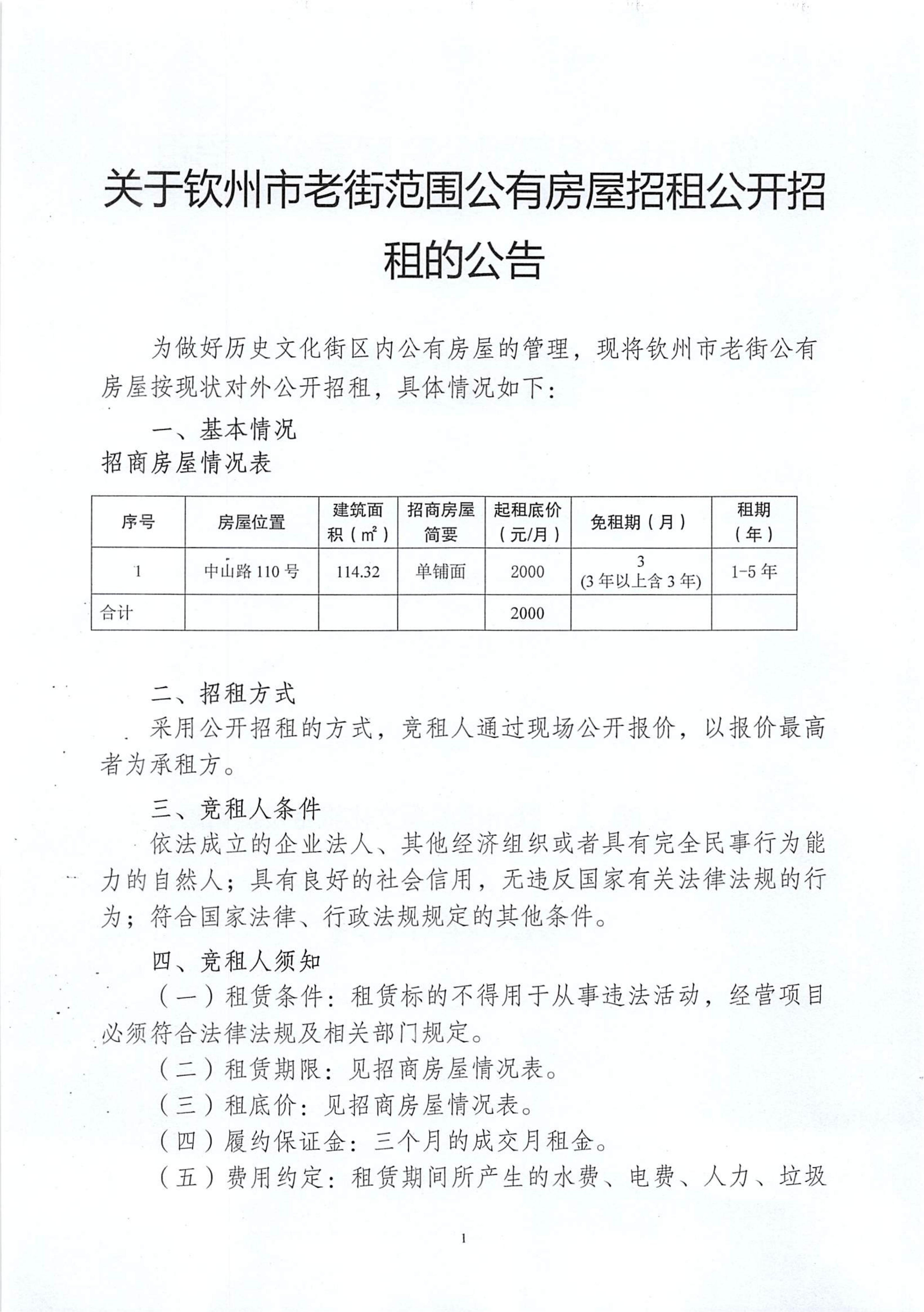 關(guān)于欽州市老街范圍公有房屋招租公開招租的公告