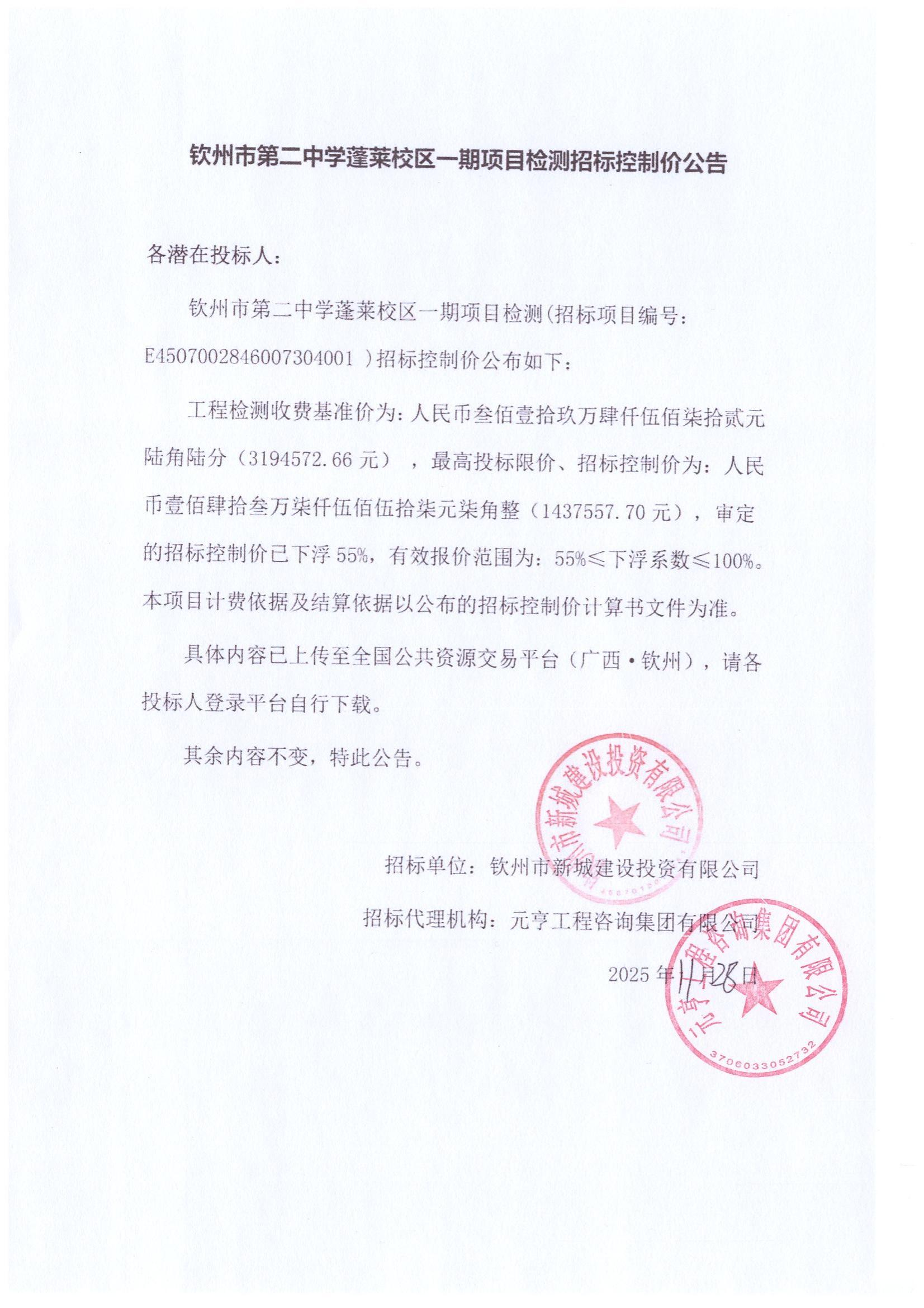 欽州市第二中學(xué)蓬萊校區(qū)一期項(xiàng)目檢測(cè)招標(biāo)控制價(jià)公告