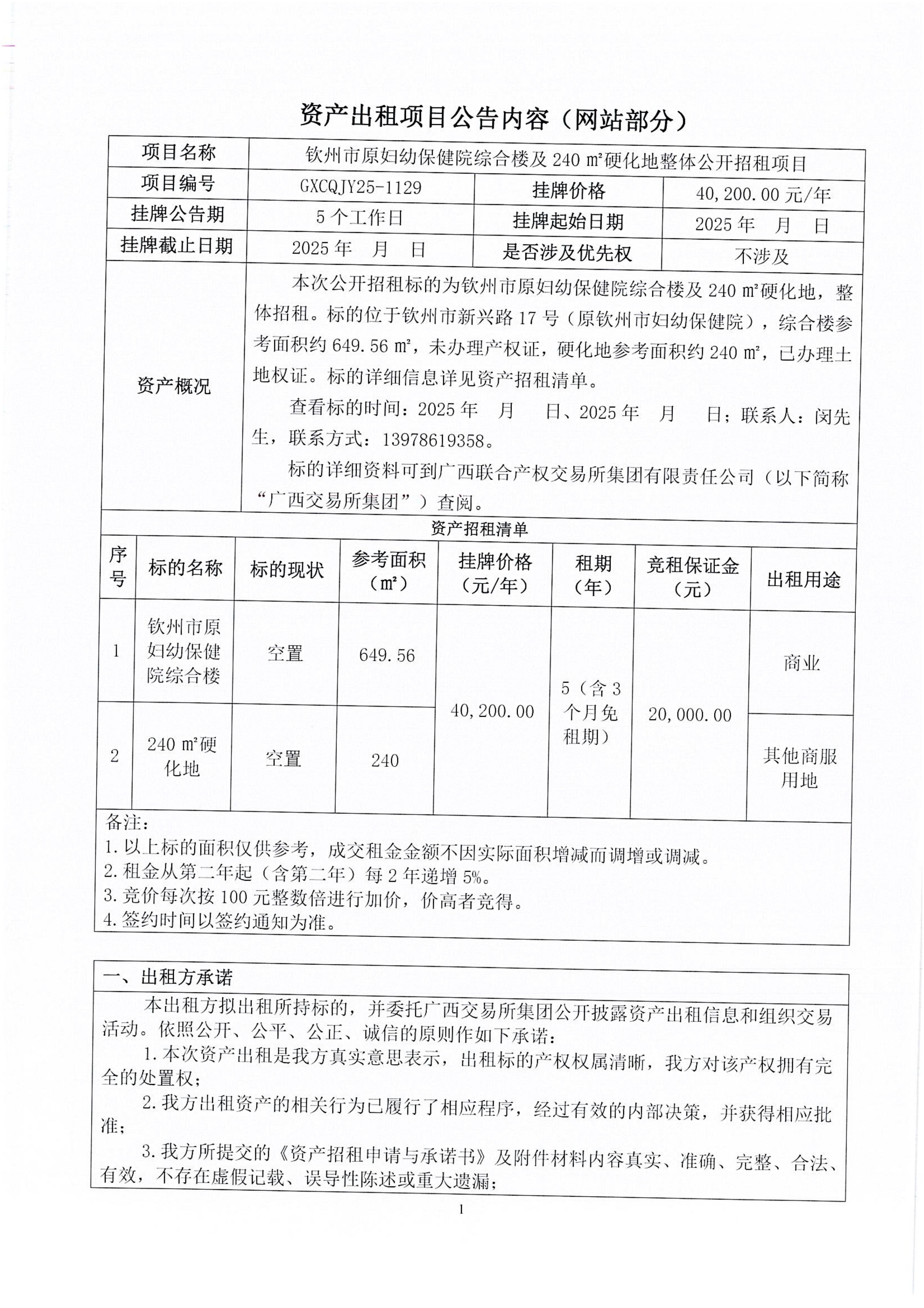 欽州市原婦幼保健院綜合樓及240m硬化地整體公開招租項(xiàng)目