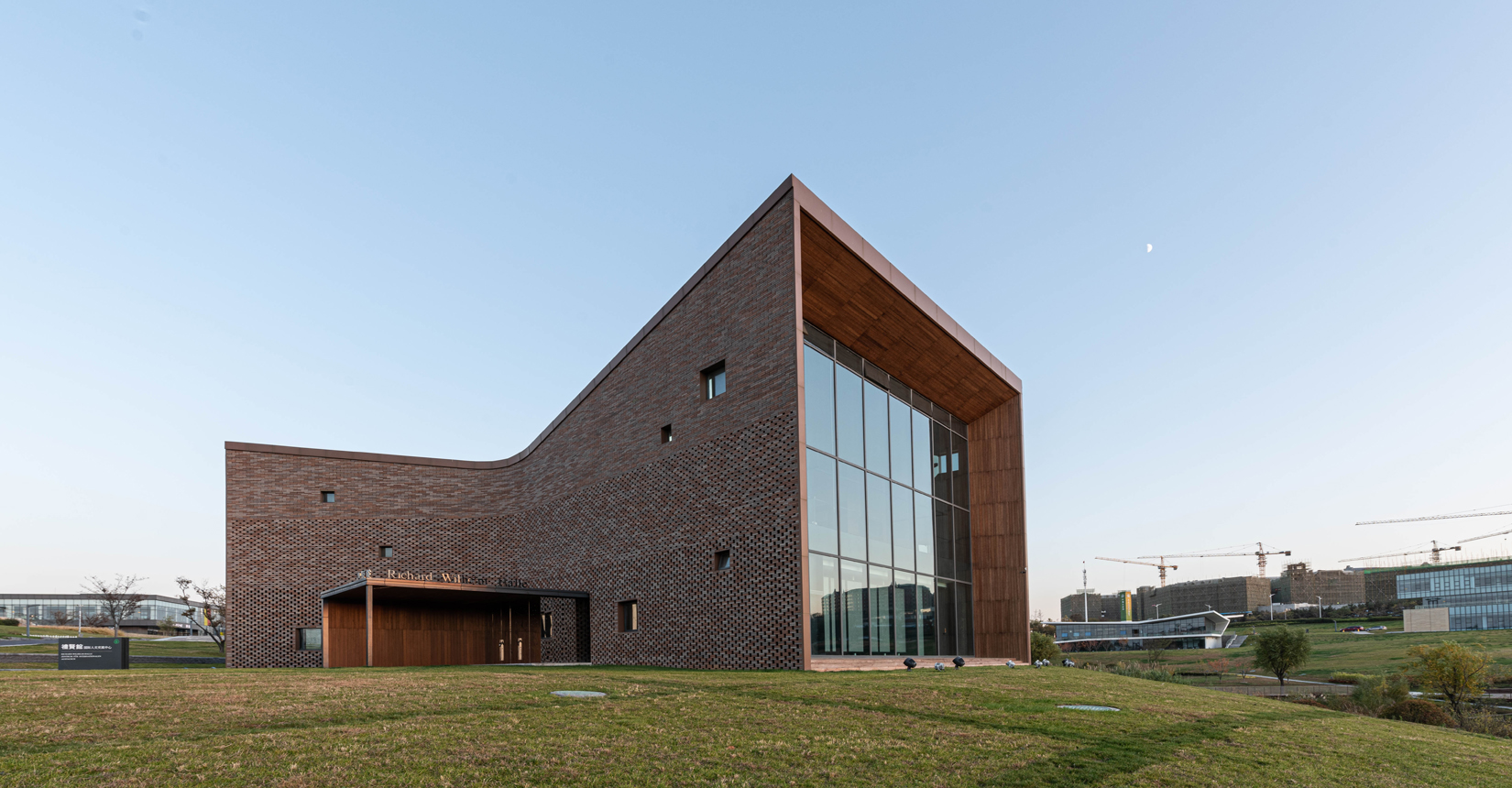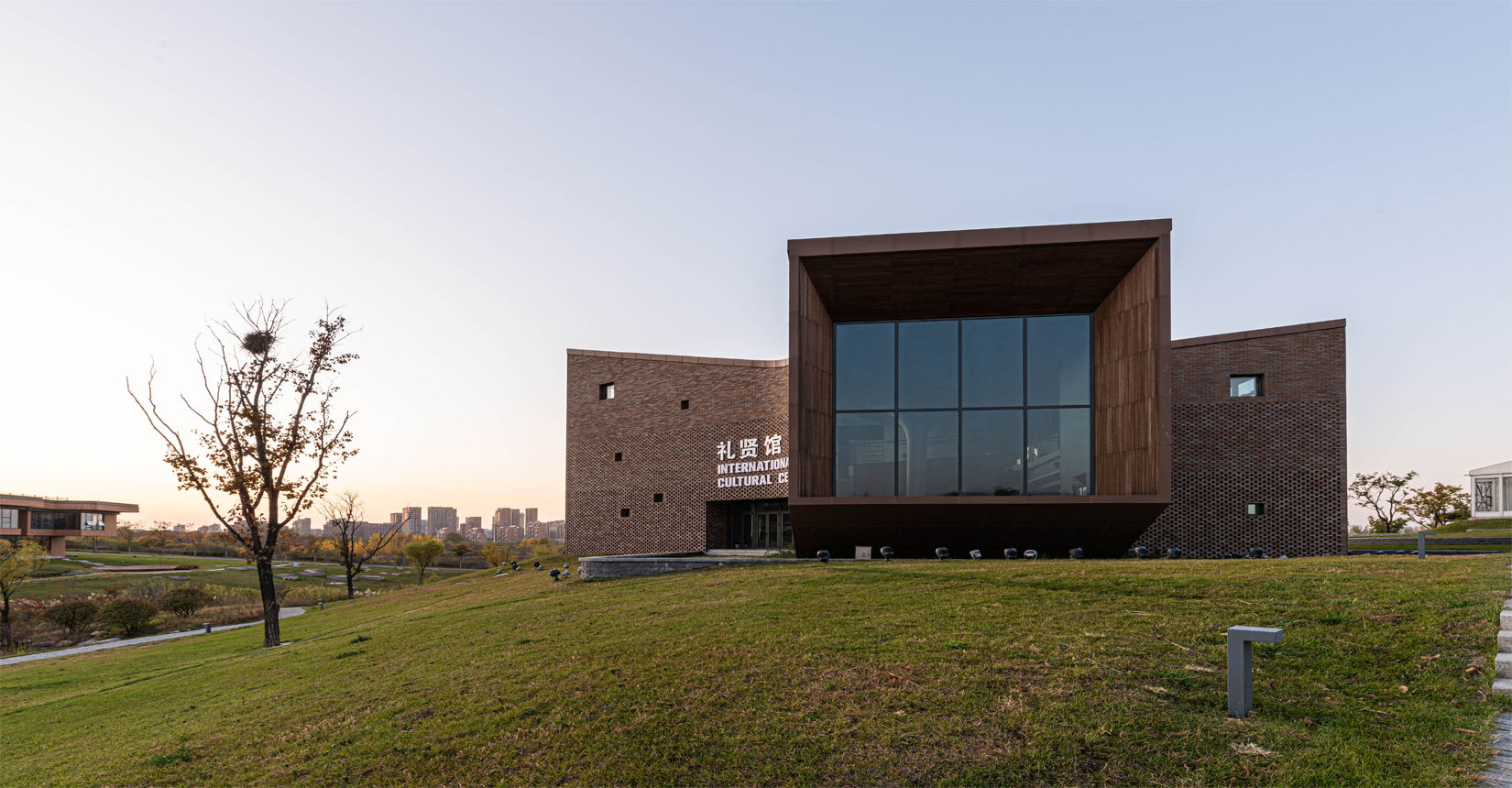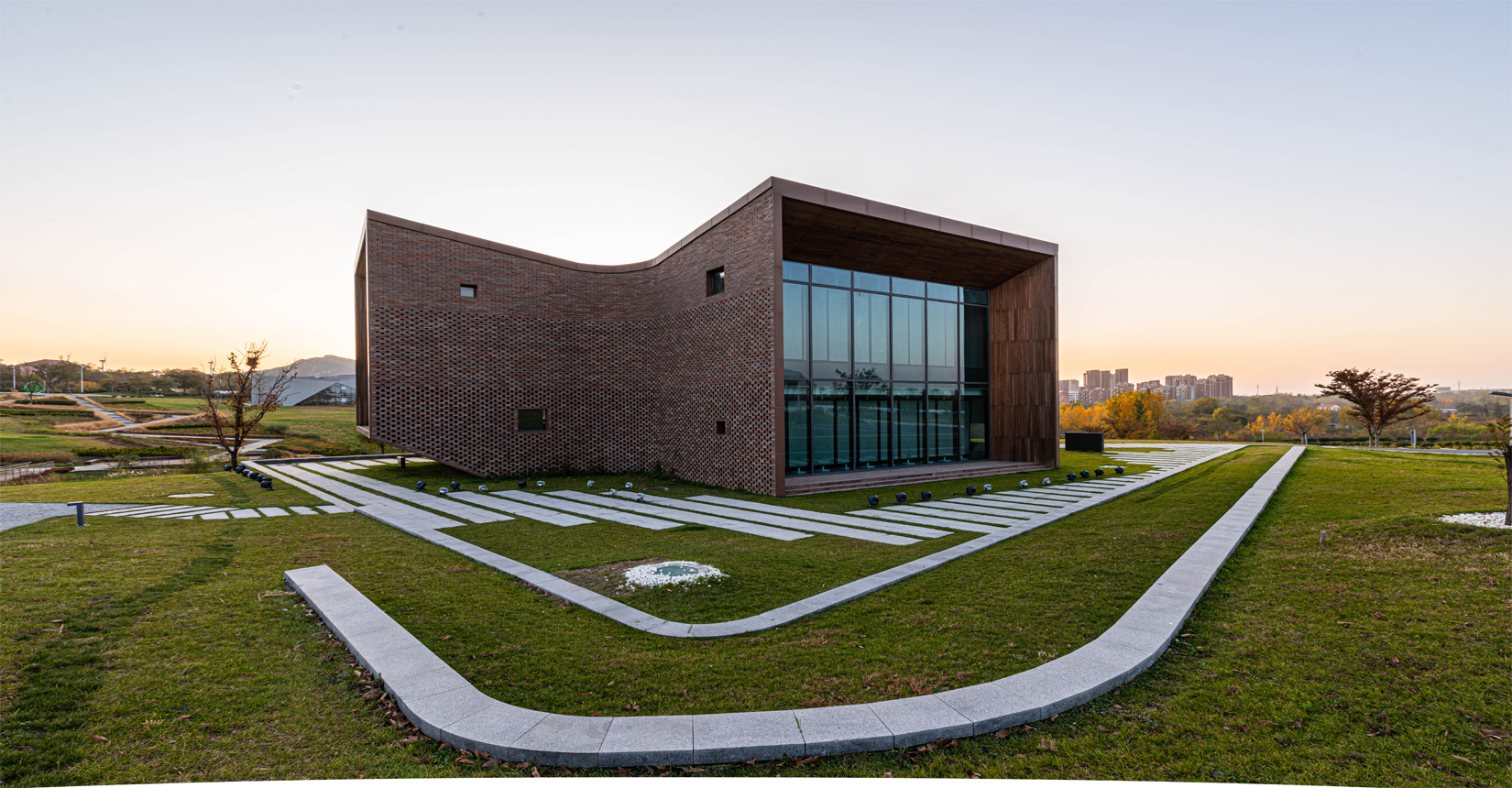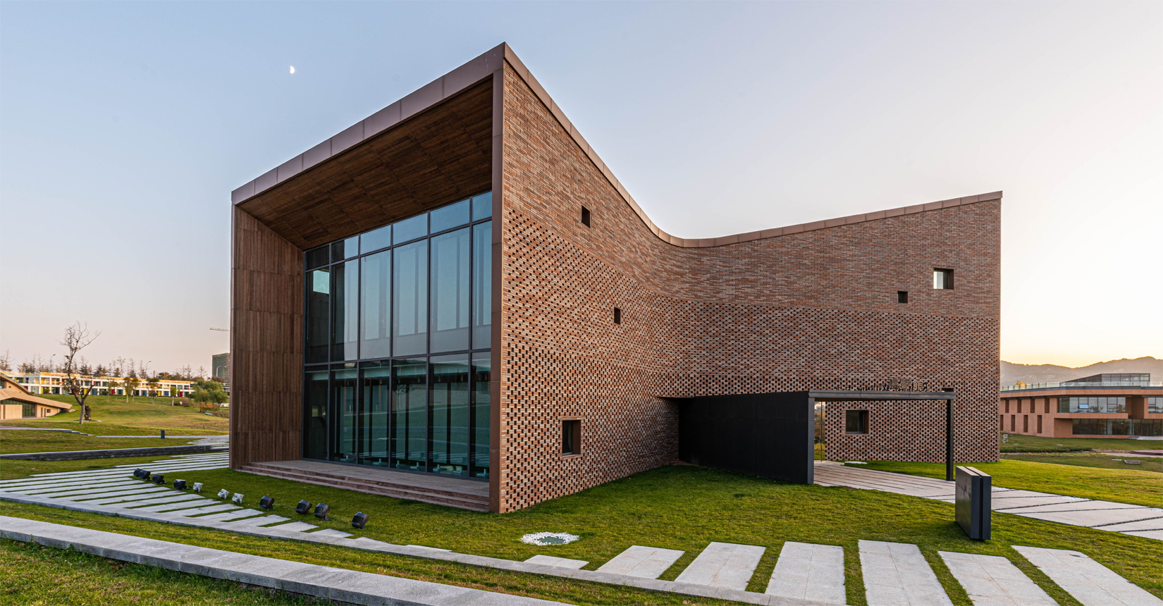 建筑南側(cè)設(shè)置次要出入口,并與水流形成互動(dòng)。建筑立面材質(zhì)采用精致的磚材拼面,屋頂采用微微揚(yáng)起的處理手法;穩(wěn)重且不失變化。