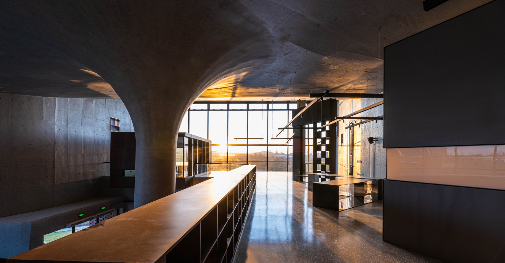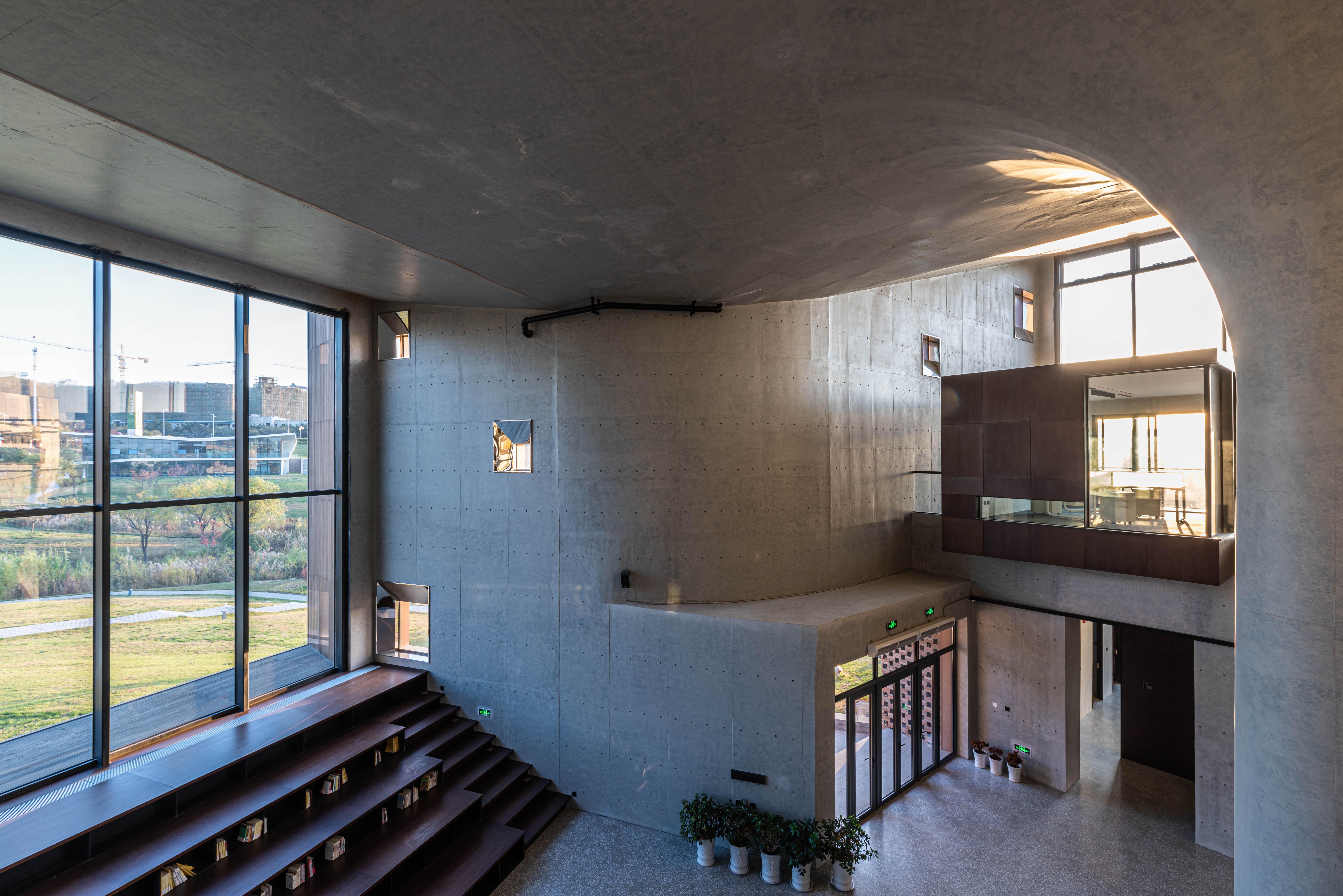 接待大廳、休息區(qū)、展覽區(qū)、室內(nèi)小劇場(chǎng)、辦公區(qū)、會(huì)議區(qū)、室外小劇場(chǎng)和自然環(huán)境相互交融并置,相互之間流線獨(dú)立又彼此滲透。