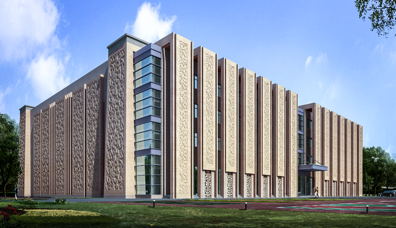 民俗造型、契丹浮雕、當?shù)厥?,設計源于當?shù)匚幕?,歸于時代潮流,簡潔的造型,龐大的體量使其成為莫旗的城市標志性建筑。