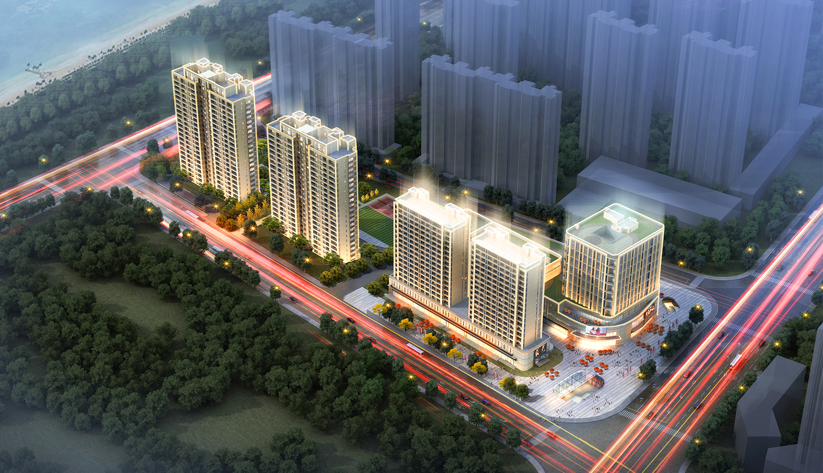 合理的功能分區(qū),沿城市主干道打造社區(qū)服務配套設施,服務小區(qū)及周邊居民,住宅建筑在融合城市肌理的情況下,最大限度遠離北側已建的住宅區(qū),減少對北側已有住宅的遮擋及影響。本項目充分利用地下公交首末站,采用了類地鐵上蓋的商業(yè)模式。