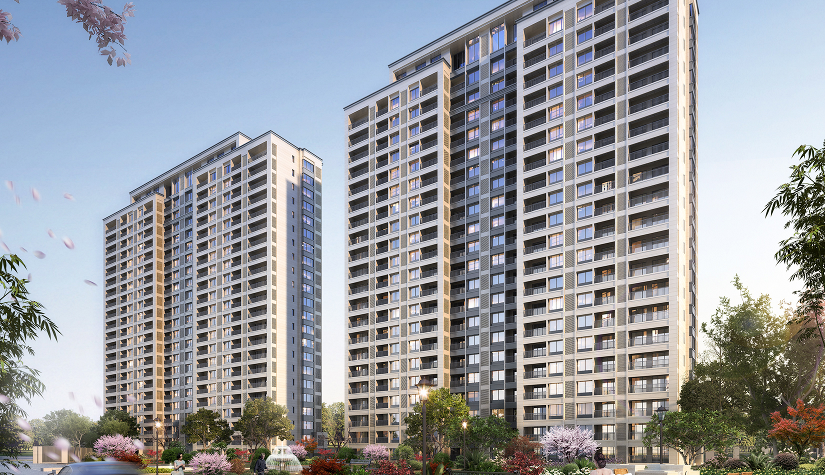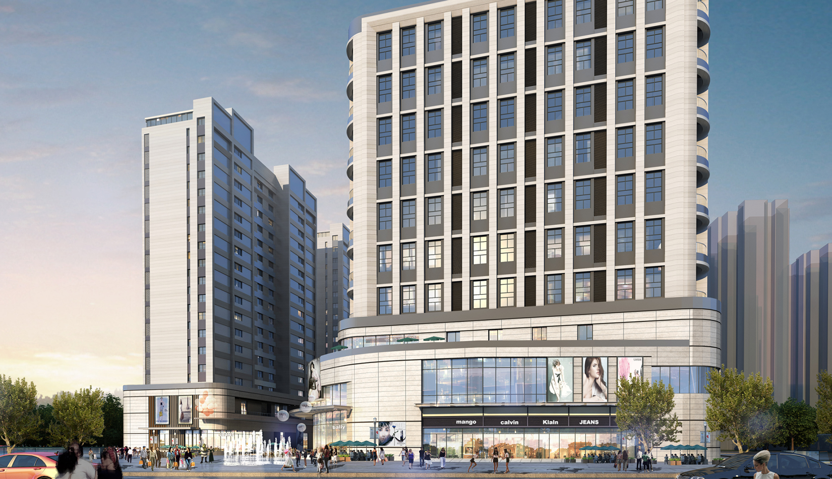 立面打造可識別性的“社區(qū)”建筑語匯,在周邊版塊中做到脫穎而出。建筑風格莊重精美,通過運用傳統(tǒng)美學法則來使現(xiàn)代的材料與結構產生規(guī)整、端莊、典雅的安定感。商業(yè)立面通過將具有力量感的矩形石材墻面和玻璃幕墻進行體塊穿插與虛實結合。勾勒出與住宅風格一致的現(xiàn)代,簡約,富有商業(yè)氣息的造型。同時,創(chuàng)造出豐富的露臺空間與立面層次,完美的樹立了本項目的沿街形象。