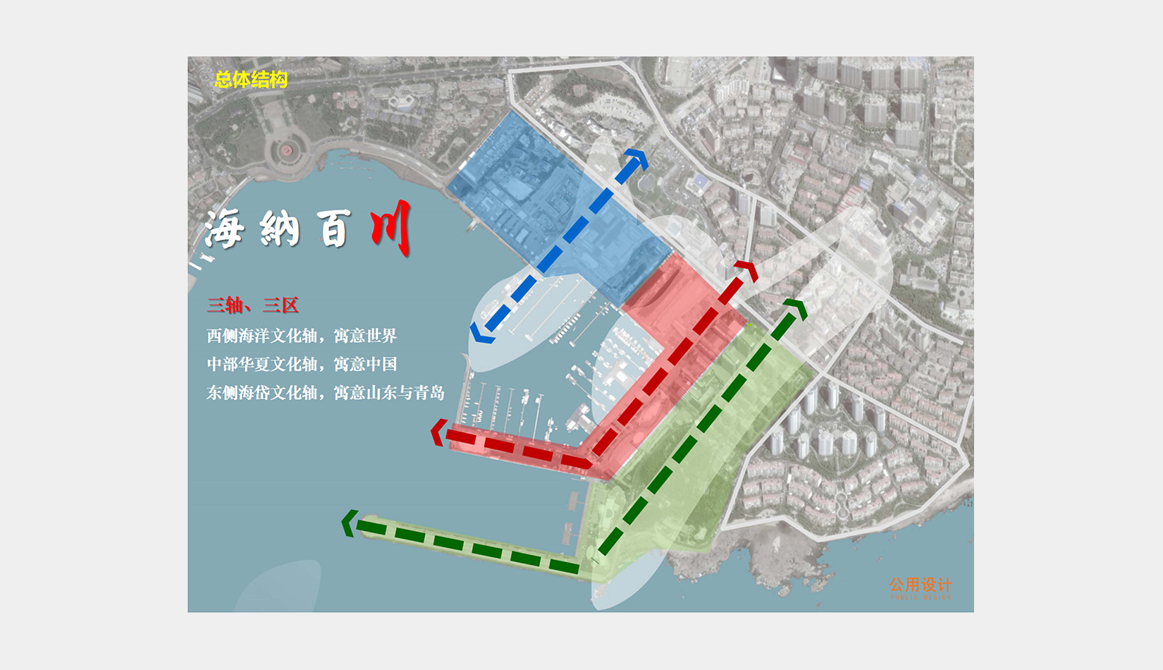總體規(guī)劃以“青島與世界對話,合作與發(fā)展共贏”為核心理念,“海納百川、帆揚世界”為主題定位,形成了三軸、三區(qū)的“川”字型整體規(guī)劃結(jié)構(gòu)。