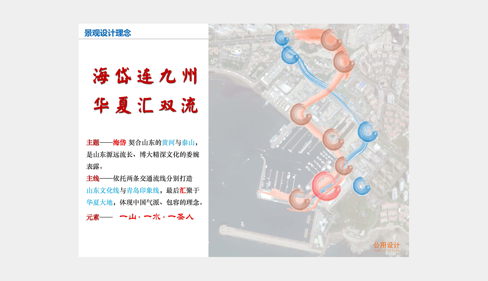 在此基礎(chǔ)上,確定迎賓動線方案,完善整個區(qū)域動態(tài)及靜態(tài)交通規(guī)劃,結(jié)合奧帆中心原有的景觀資源和山東、青島文化元素,以“海岱連九州,華夏匯雙流”為景觀設(shè)計理念,布局重要景觀標(biāo)志節(jié)點。