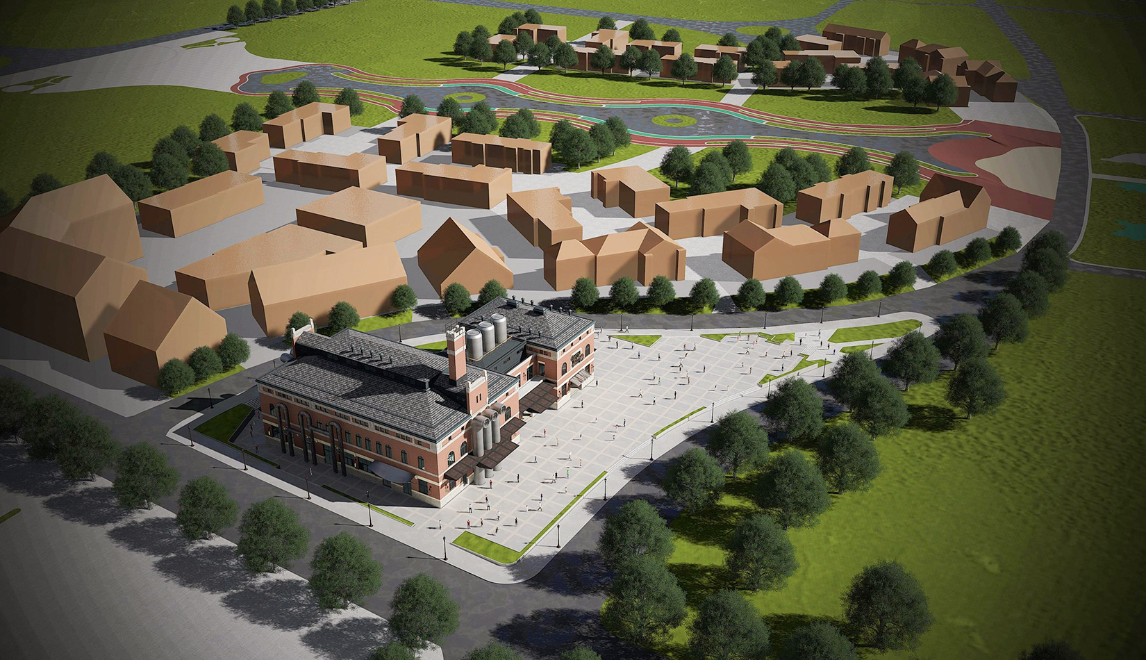 紅磚是工業(yè)風(fēng)的最佳表現(xiàn)元素之一,本案選取紅磚作為立面主要材質(zhì),加以真石漆、石材進(jìn)行點(diǎn)綴,磚塊與磚塊中的縫隙可以呈現(xiàn)有別于一般墻面的光影層次。屋面形式選取深灰色瓦屋面加以深色金屬板點(diǎn)綴,與立面形成強(qiáng)烈的視覺對(duì)比,旨在體現(xiàn)工業(yè)風(fēng)的粗獷氛圍。